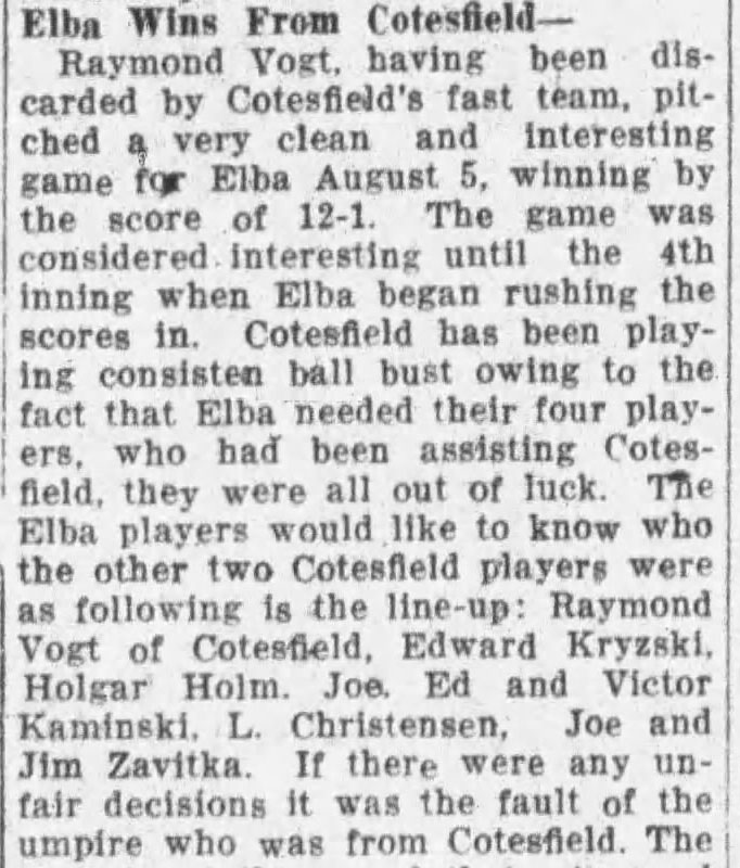 In 1923 Ray was discarded by Cotesfield's fast team and pitched a very clean game for Elba to beat Cotesfield 12-1.
