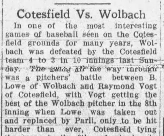 In 1923 Ray was playing baseball for Cotesfield as their pitcher and also "won his own game" in the tenth against Wolbach "with a long drive scoring Horak."