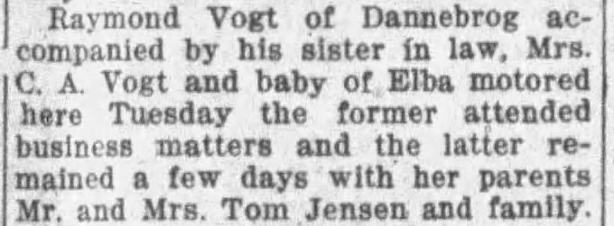 Like his brother Chris, not a lot is known about Ray's personal or work life. In the February 6,1929 Howard County Herald we learn that Ray was living in Grand Island and was selling cars (Chevrolet and Buicks). It was also reported that on the previous Saturday evening Raymond had come up from Grand Island and visited his wife at the N. B. Johnson home (her parents). On September 4, 1929 Mr. and Mrs. Raymond Vogt of Grand Island came to Elba to celebrate the fifth birthday of Betty Ann and the second birthday of Margery Ann. On November 11, 1931 Ray, apparently unaccompanied, attended a surprise birthday party for his brother Chris and cousin Kenneth (who had the same birthday). In that same edition of The Phonograph newspaper it was reported that Ray had motored to Western Nebraska in hopes of finding some corn husking work. (2)