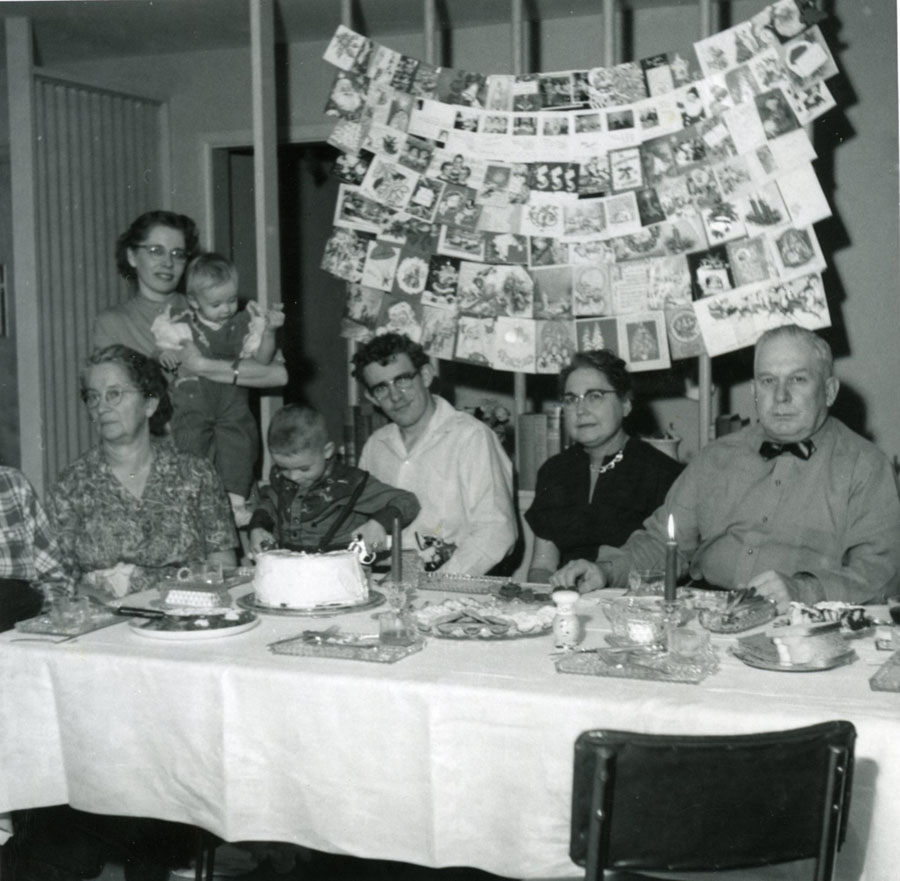 Dinner at Lyncrest, December 1956 in living room - L-R Grandma Barr, Mom holding Bev, Doug, Gary, Edna and Ray.