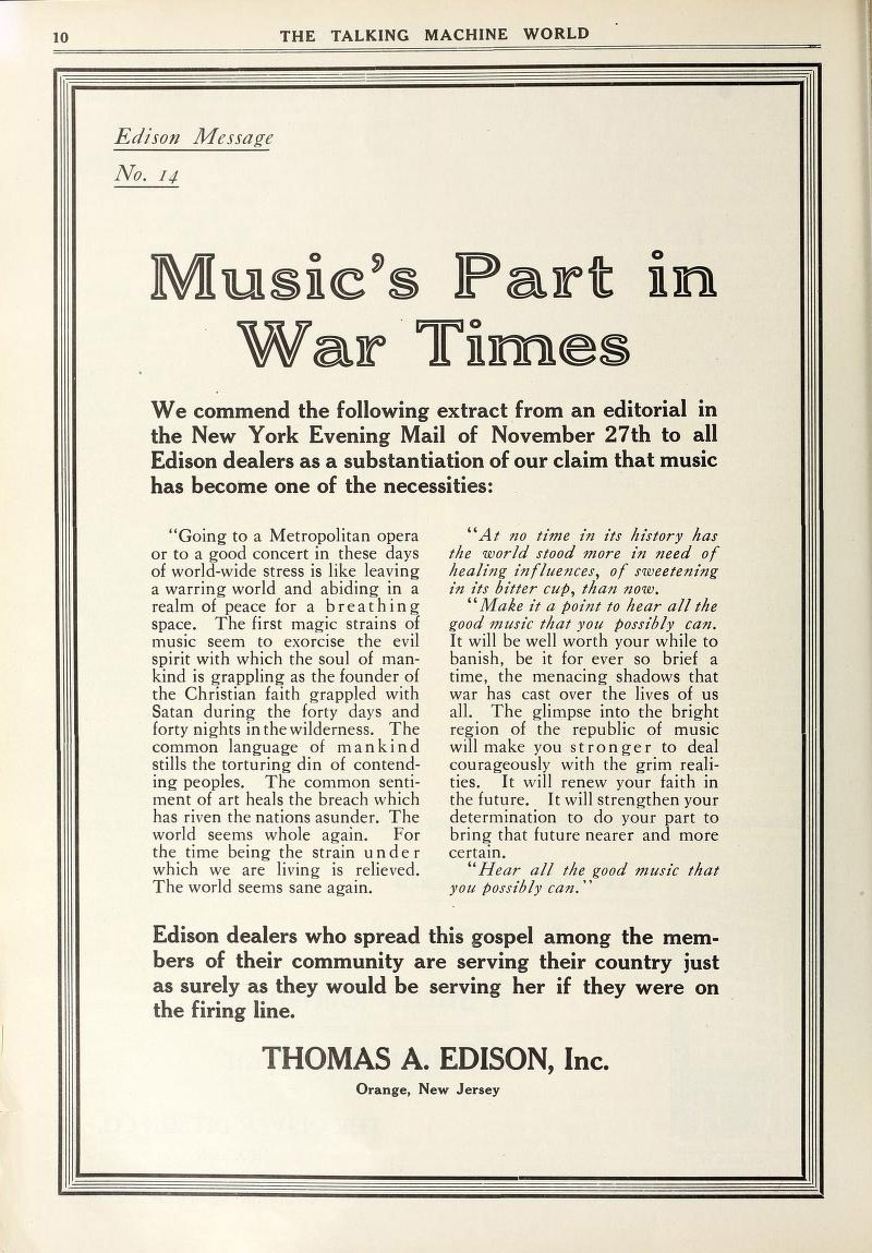 World War I, however, was the reality of the time and Edison used that advertising space more and more to make connections between the war, business and the importance of music as food for the soul, as a "healing influence," a "vital force," and "indispensible to our soldiers."