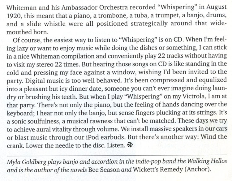 Hanging on the Gramophone - How an 80-year-old piece of furniture can make such sweet, sweet music by Myla Goldberg* Spin Magazine, November 2006