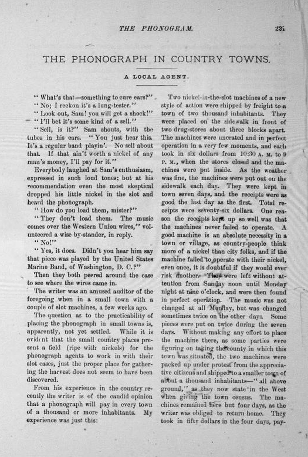 The following was written for the trade magazine The Phonogram by a "local agent" concluding that the Phonograph's coin-in-the-slot business could be profitable in country towns and villages of one thousand or more and that "the sooner that it can be put to work" the better "for us all."