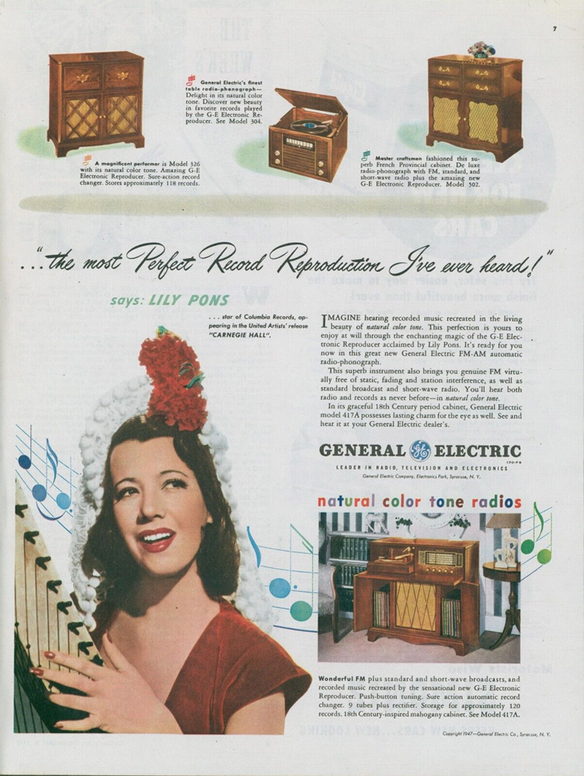 Lily Pons says "...the most Perfect Record Reproduction I've ever heard!" General Electric Radio Phonograph, 1947
