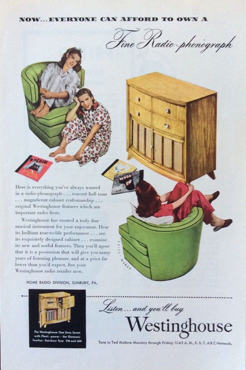 "Listen...and you'll be amazed at the true-to-life tone." Westinghouse Radio-Phonograph, 1947