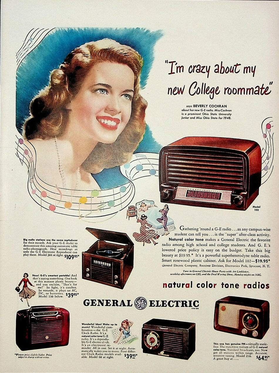 Table radio-phonograph and General Electric radios with Beverly Cochran, Miss Ohio State for 1948