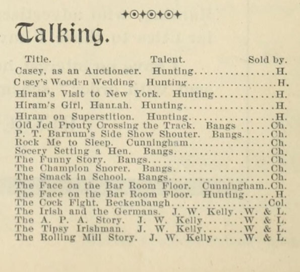 One of the most popular pre-1900 recording artists was Russell Hunting, "an American comic entertainer, pioneer sound recordist, and an influential figure in the early years of the recorded music industry....He became famous for his series of comedy sketches about an Irish character named Michael Casey. The recordings consisted of rapid-fire cross-talk between two characters, with Hunting taking all the parts." (Wikipedia).