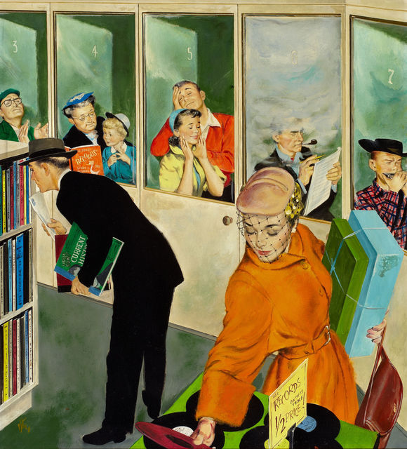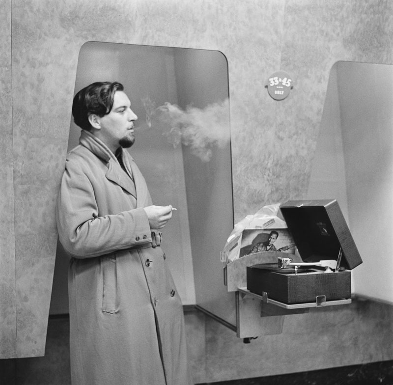 The following photos are from a delightful series of photographs titled c. 1955 Vinyl listening booths Sampling the hits -- and a cigarette by Alex Q. Arbuckle.