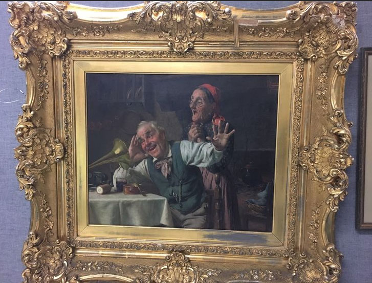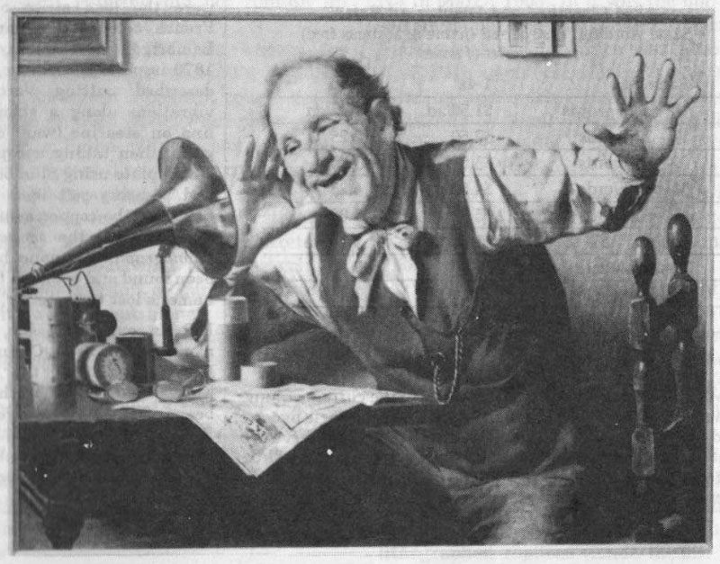 "This famous painting is remarkable for the delight and amazement depicted upon the faces of the old couple upon their first hearing the Phonograph."