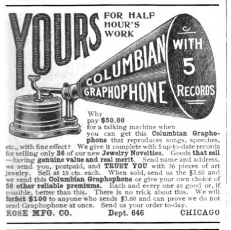 Sell 35 lbs of Baker's Teas, Spices and Baking Power and "secure a Gramophone." Munsey's Magazine, 1897 (also see September, 1897 McClure's Magazine).