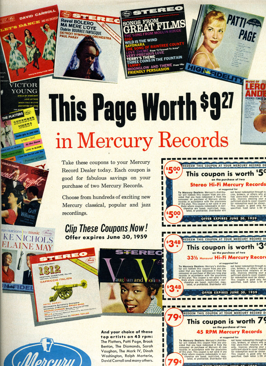 Mercury Record Corporation - Clip Coupons and "Take to your Mercury Record Dealer today." Life magazine, June 15, 1959