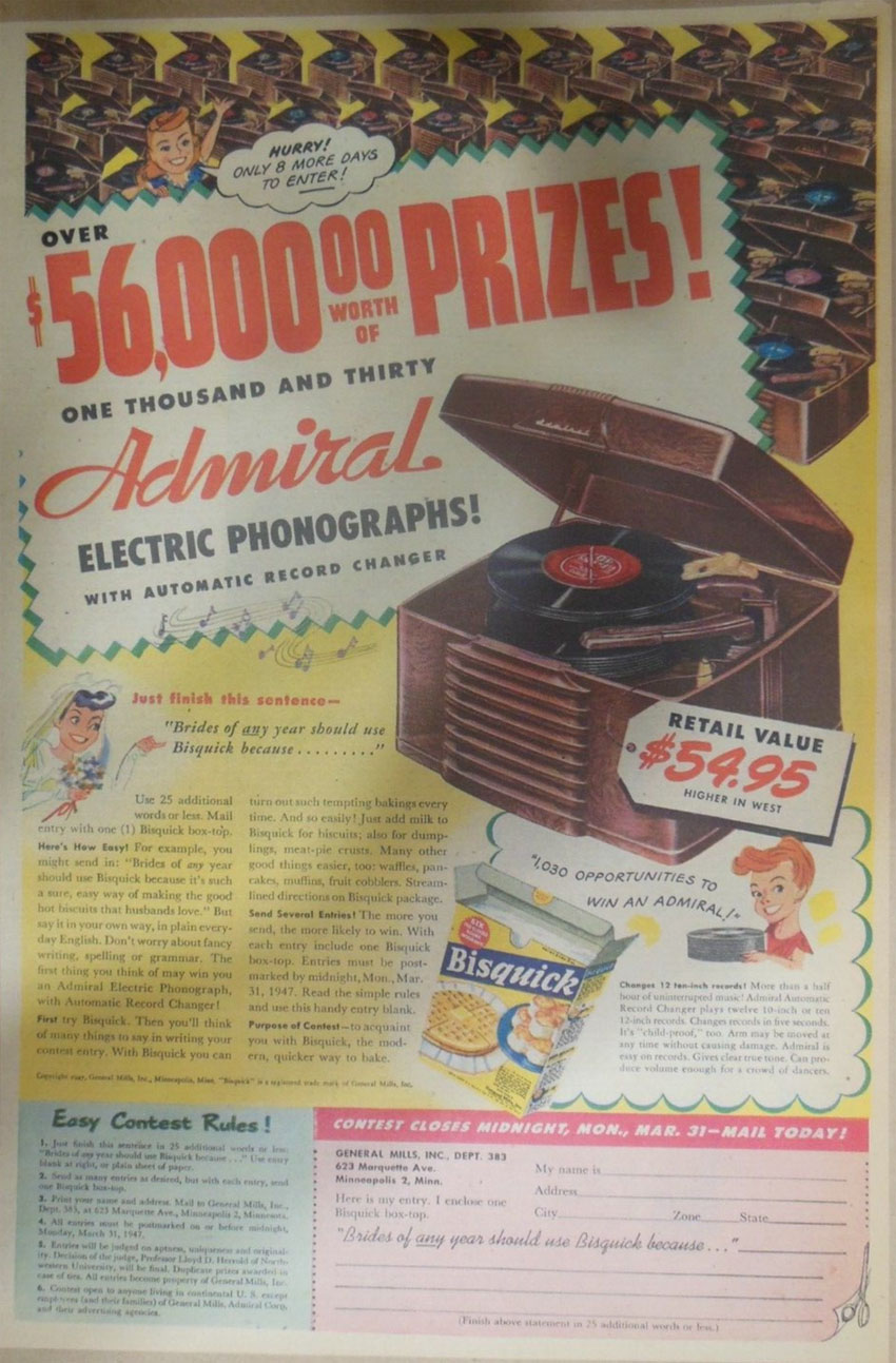 Win a free Admiral Phonograph in Bisquick's Contest to "Just finish this sentence" -- Newspaper ad 11" x 15" 1947
