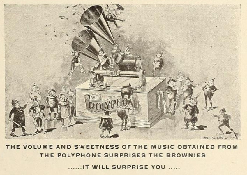 Polyphone* - An attachment (not a machine) made in 1898 by the Talking Machine Company of Chicago for Phonographs and Graphophones. "By contriving two reproducers to track in the same groove, it was claimed that volume would be doubled." (20A) (TMC2)