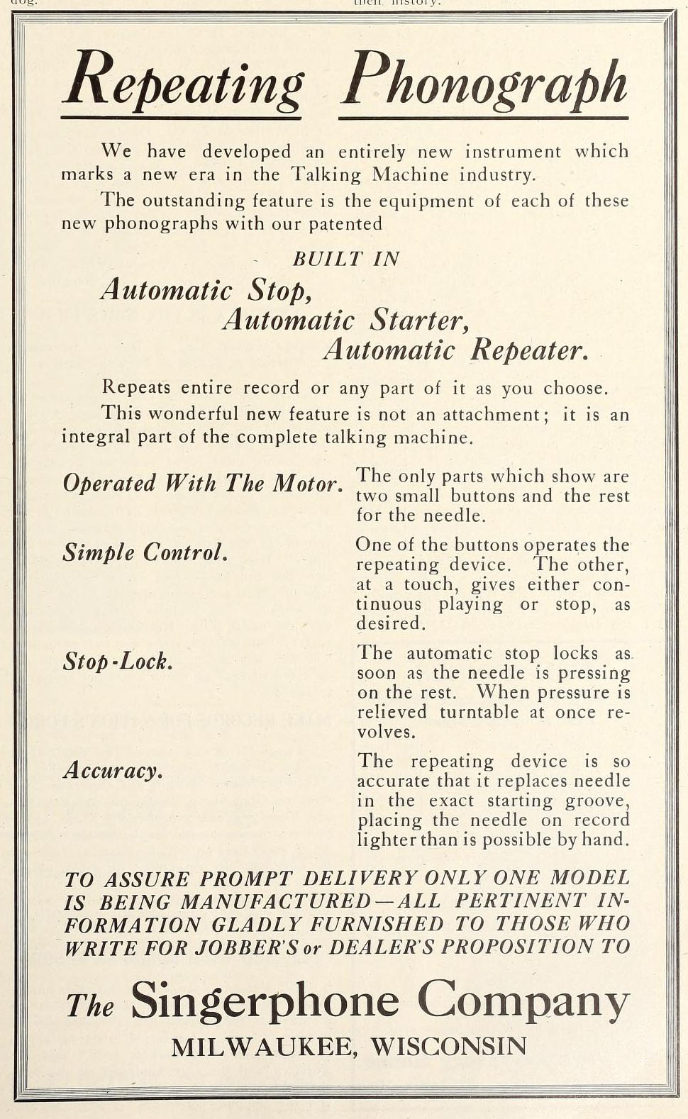 Singerphone – The Singerphone Company, Milwaukee, Wisconsin. June 1920 TMW. In July TMW Singerphone advertised "We have developed an entirely new instrument which marks a new era in the Talking Machine industry." Each our of new phonographs has our "Automatic Stop, Automatic Starter, and Automatic Repeater."