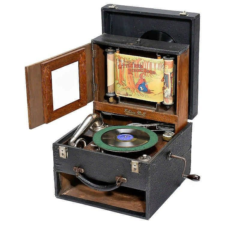Picturegram — Edison Bell Consolidated Phonograph Co., Ltd - Child's gramophone "played small (six-inch) Crown records on which a fairy story was related while a printed paper rool of accompanying illustrations moved across the compartment behind." c. 1924 (CPG)