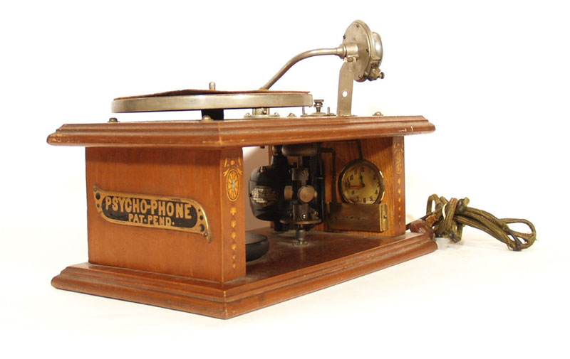 Psycho-Phone – The 1927 disc playing Psycho-Phone was "designed to play a pre-recorded message to its slumbering user during the night...Self-improvement thorugh subliminal stimultation." (5-44) A cylinder Psycho-Phone was also made "driven by an electric motor allowed the "user to record his own messages tailored to personal life struggles, such as, "Writing books makes me rich." (5-45) (DAP)
