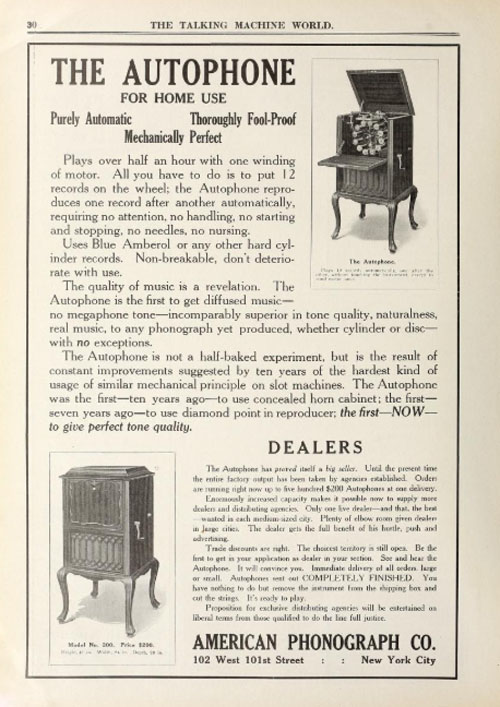 Autophone - The cylinder playing “Autophone” with 12 selections was made in San Francisco by The Autophone Co. (also a division in the city of New York). The “Autophone” for cylinder play, which was a very nice instrument, was designed by Cornelius Reinhardt. (3B) (HCP). The Talking Machine World January 1915 ad says that the Autophone "was the first...to use concealed horn cabinet."(FOTP)