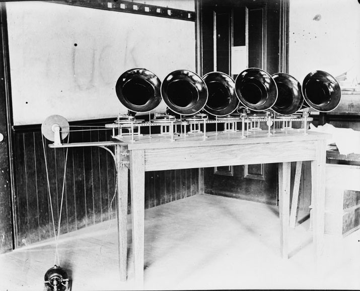 Chronophone* – The Chronophone is an apparatus patented by Léon Gaumont in 1902 to synchronise the Cinématographe (Chrono-Bioscope) with a disc Phonograph (Cyclophone) using a "Conductor" or "Switchboard". This sound-on-disc display was used as an experiment from 1902 to 1910. Courtesy of Wikipedia