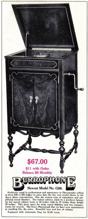 Burrophone – A phonograph sold by the Burroughes Furniture Company, Toronto, Ontario. 1929 ad courtesy of Betty Pratt of CAPS. (4)