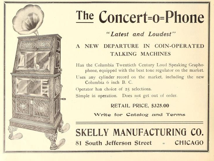 Concert=o=Phone, aka Skellyphone - Skelly Manufacturing Co., 81 South Jefferson Street, December 15, 1906 p. 74 TMW (FOTP) - Note: The Skellyphone is identified as a machine in The Patent History of Phonographs. (AK)