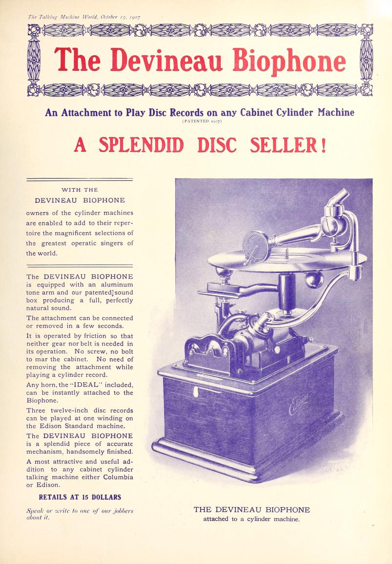 Devineau Biophone* – An Attachment to Play Disc Records on any Cabinet Cylinder Machine - The Talking Machine World, October 15, 1907 (FOTP)