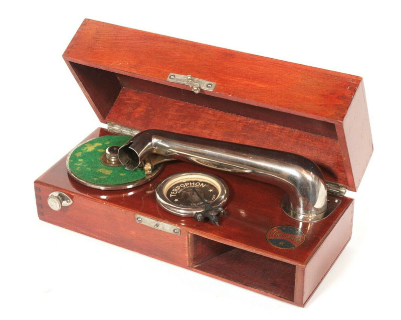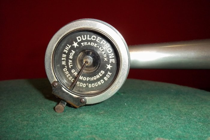 Dulcephone – Dulcephone gramophones are believed to have been imported, or assembled from imported components, by Barnett Samuel & Sons London. "The Decca name appeared on their first portable in 1914. "The Decca Dulcephone, as it was called on early models, had a deep lid containing a metal bowl rerred to as the "Dulciflex...It's popularity in the trenches of the Great War has earned the Decca of the Dulciflex type the name "Trench" Decca among collectors." (CPG, p.66-67.