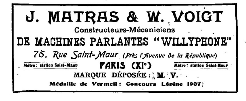 "Willyphone" - Matras & Voigt, Paris Record Store which opened in 1908 at 76, rue Saint-Maur, Paris and closed in 1911. Offered a Talking Machine called the "Willyphone" (Disquaires de Paris)