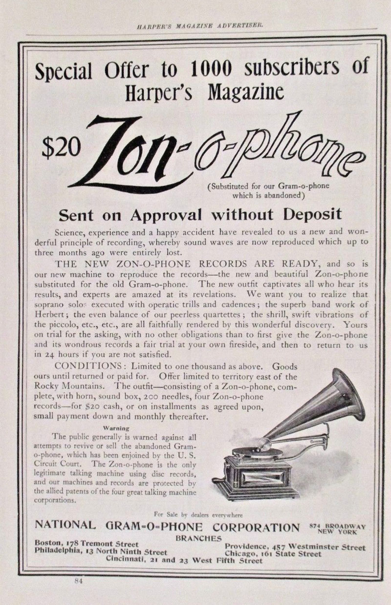 Zon-o-phone - National Gram-o-phone Corporation, 874 Broadway, New York, Harpers Magazine 1900