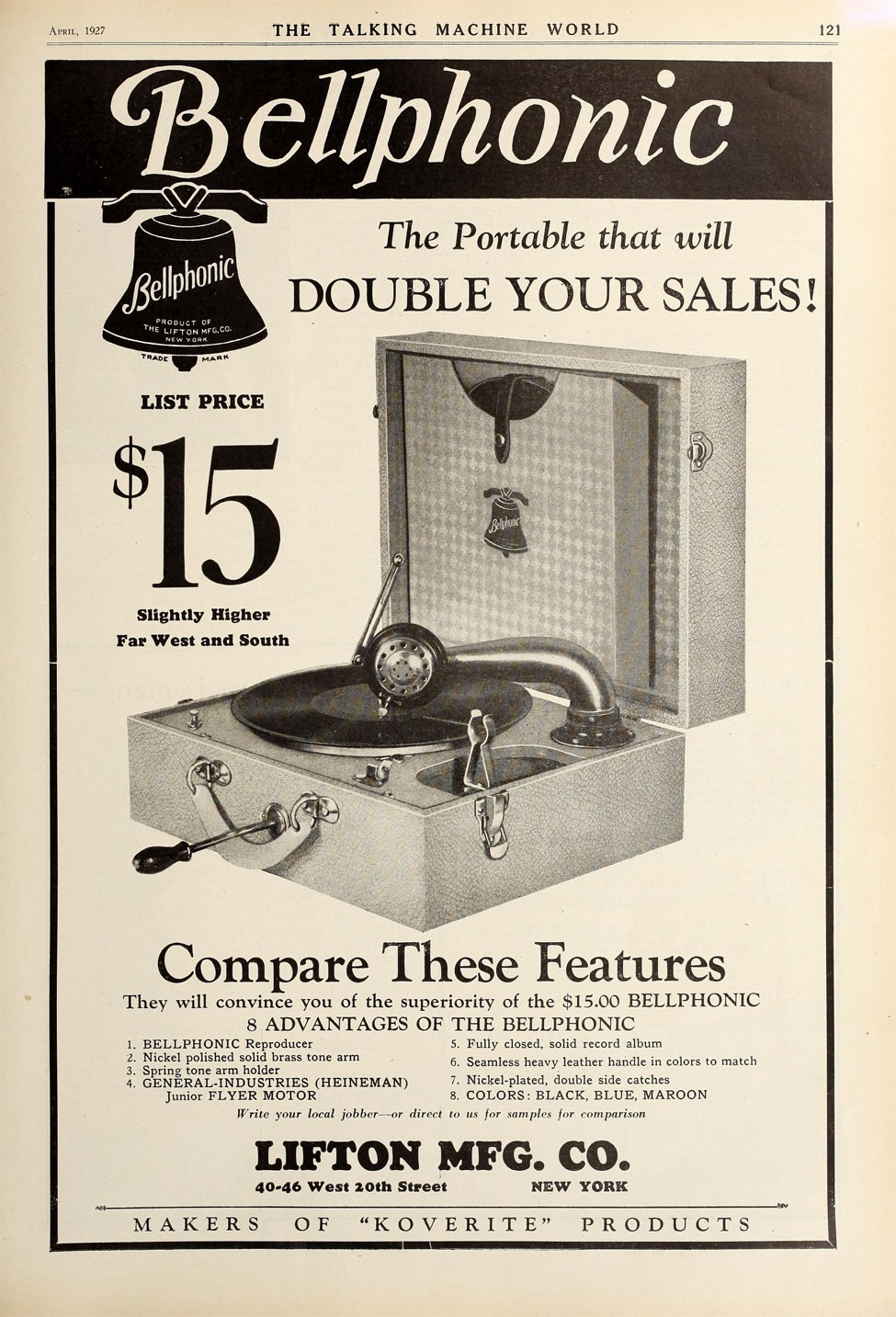 Bellphonic – Lifton Mfg. Co., 40-46 West 20th Street, New York April 15, 1927 TMW (FOTP)