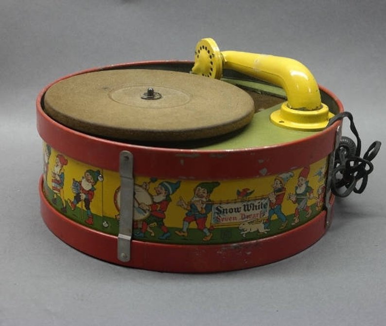 Portofonic, New Fono Drumette, J. Chein & Co., 'Snow White and the Seven Dwarfs' circa 1930's, 78rpm record player.