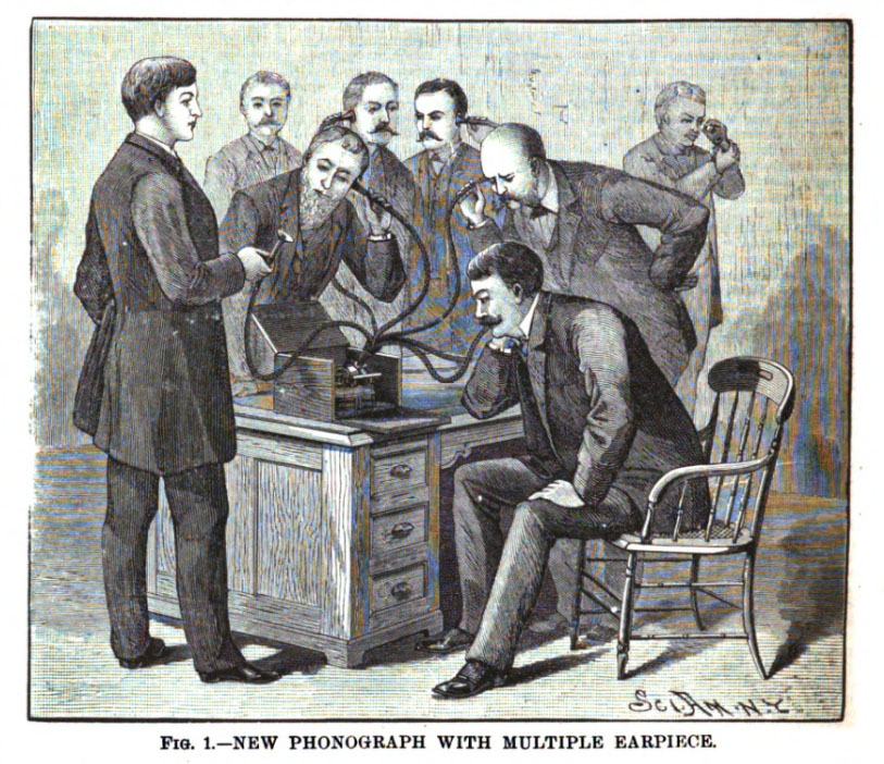 The similiarity between the sewing machine and the phonograph was often noted in early descriptions of the Phonograph. In an article about the early phonograph and its future Philip G. Hubert described the phonograph in the February 1889 issue of The Atlantic as follows: