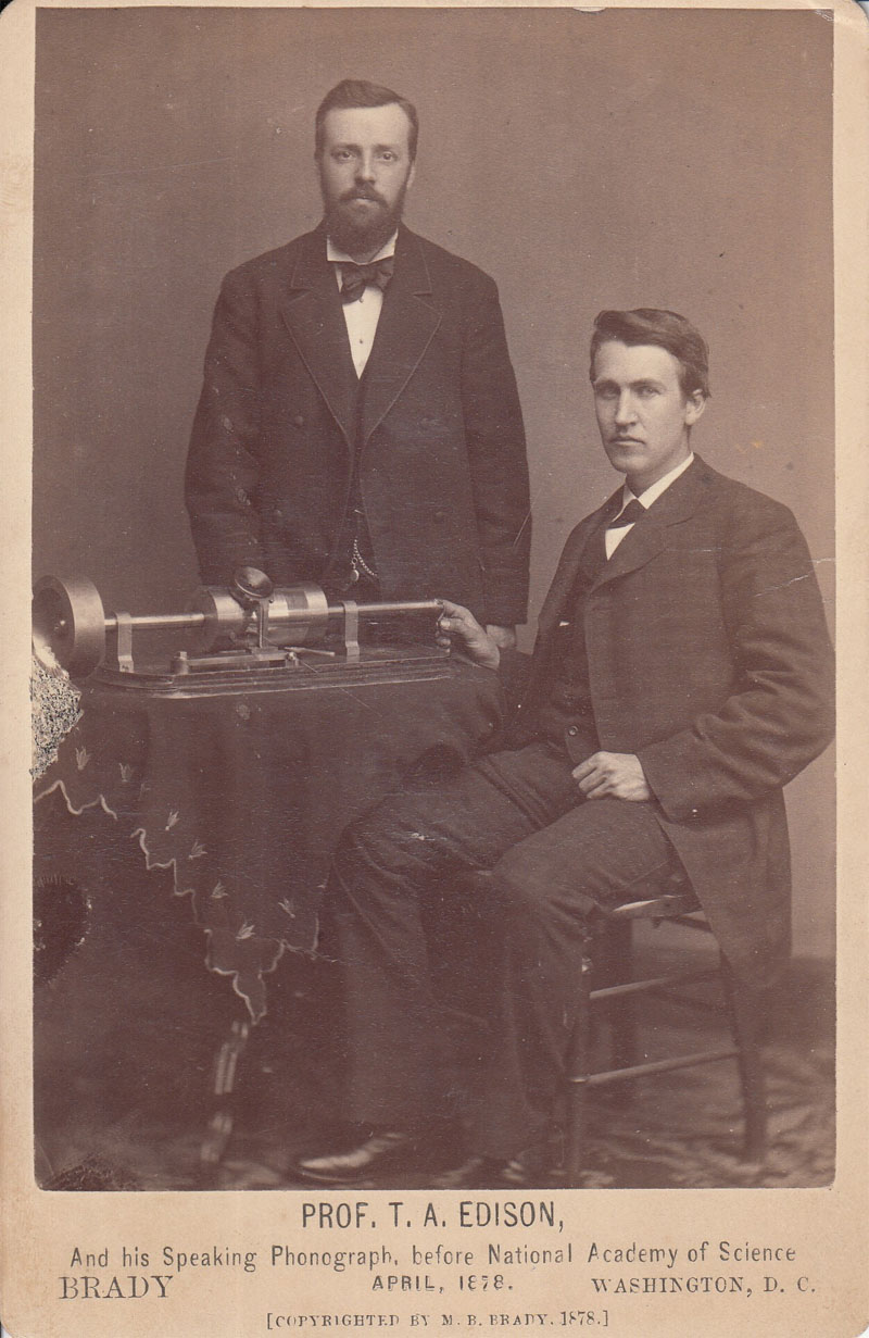 Edison seated with his 1878 "Brady" tinfoil phonograph and Charles Batchelor, Edison's chief assistant at Menlo Park, standing next to Edison. This 1878 tin-foil phonograph is called the "Brady phonograph" by collectors because it was the machine pictured in the photograph taken at the Mathew Brady Studio on April 19, 1878. (Wikimedia Commons courtesy of U.S. National Park Service)
