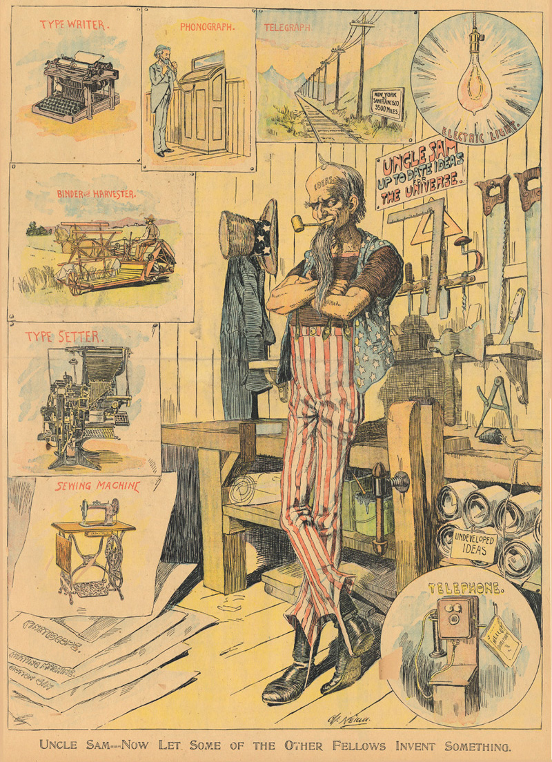 Note that the Phonograph and the Sewing Machine are two of the prized inventions of "Uncle Sam--Now Let Some of the Other Fellows Invent Something" by Charles Nelan, New York Herald, January 9, 1898 (2)