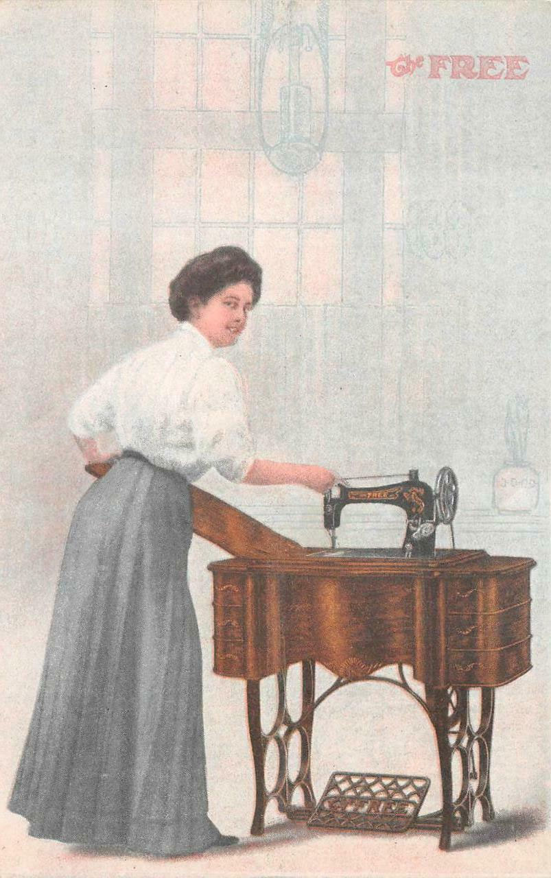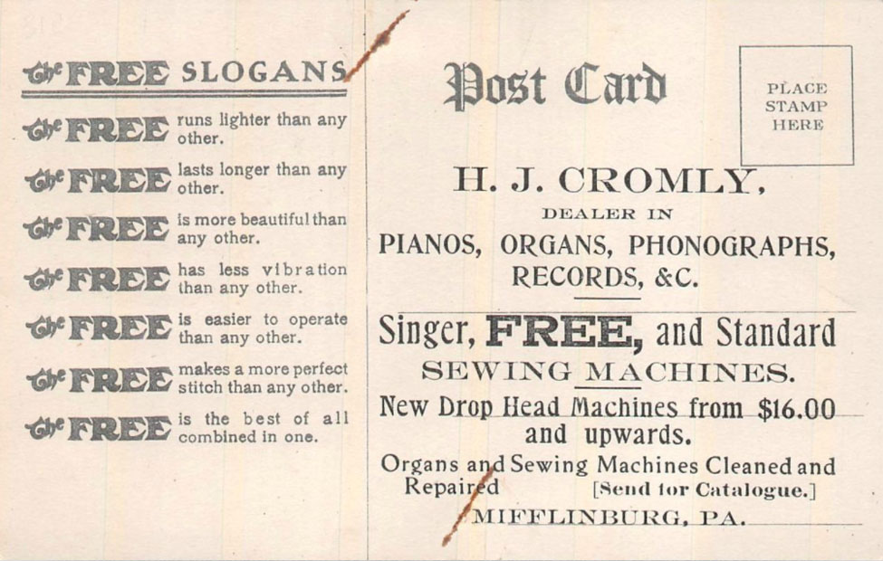 Sewing machines were often sold by dealers who also sold phonographs such as this Pennsylvania dealer who sold pianos, organs, phonographs, records, and sewing machines. This advertising postcard c.1912 features the "Free" Sewing Machine.