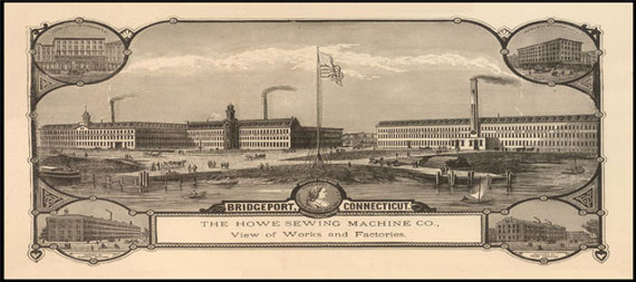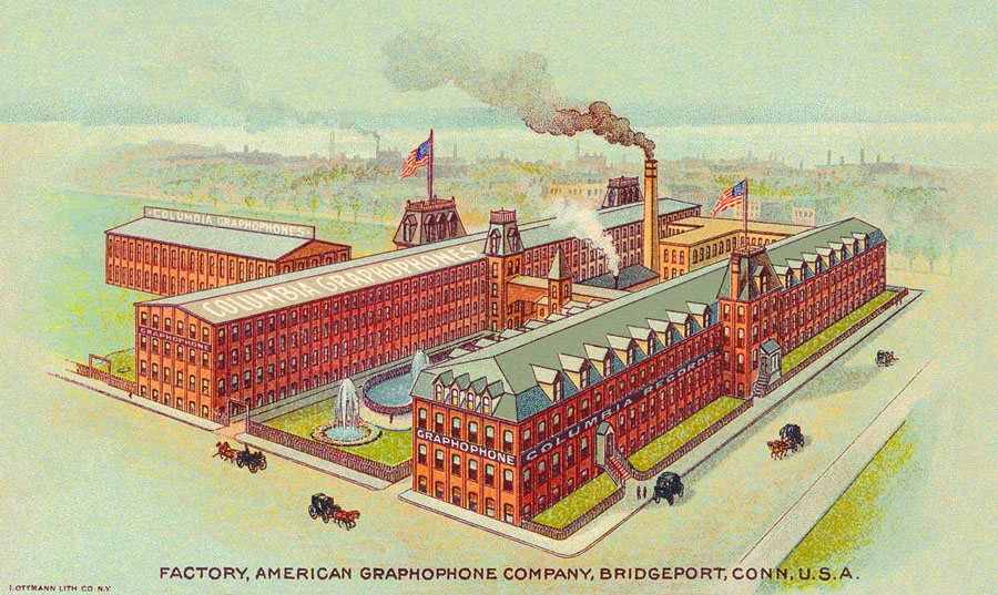 Early Graphophones were manufactured at the Howe Sewing Machine Factory. Howe closed their Bridgeport factory in 1887 and it became the American Graphophone manufacturing plant. Business 'dictation' talking machines compatible with Edison cylinders were modified treadle machines. In the Howe factory "many of the same cabinet makers and finishers continued on in the factory making graphophones with similiar materials and finishes."