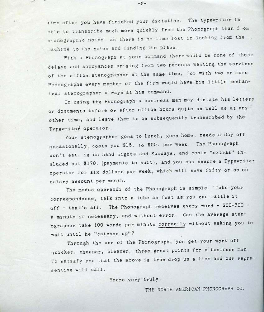 North American Phonograph Co., Circular sent to perspective businesses on September 18, 1893
