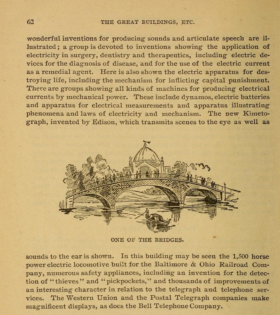 Included In the Electrical Exhibits in the Electricity Building are the phonograph, and "the new Kimetograph, invented by Edison, which transmits scenes to the eye as well as sounds to the ear." Ibid, pp. 61-62.
