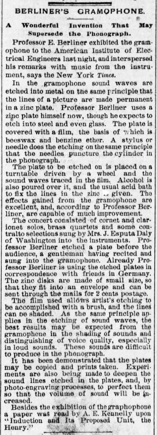 "BERLINER'S GRAMOPHONE." A Wonderful Invention that May Supersede the Phonograph.