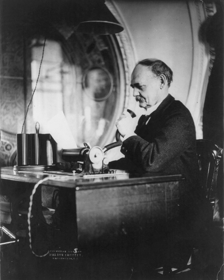 This photograph shows a Congressional Reporter using a cylinder dictating machine, in its role as a business machine, to transcribe records (from the Library of Congress, circa 1908).