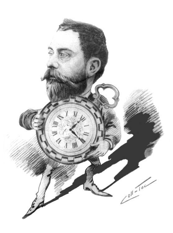 Caricature of French watchmaker and inventor Henri Lioret (1848–1938) with his watch La Cigale.