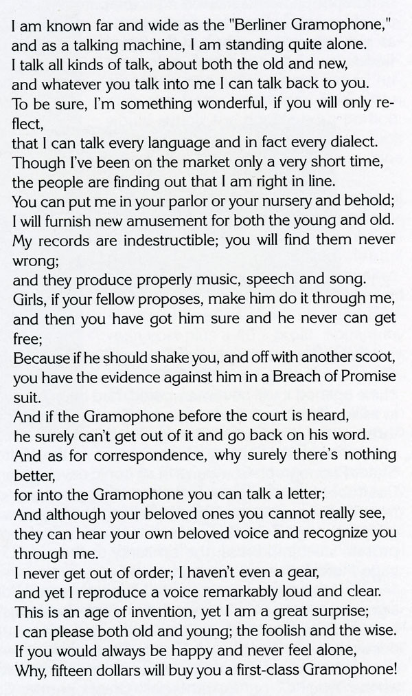 Graham also recorded this advertisement for the Berliner Gramophone (transcript below but recording not available)