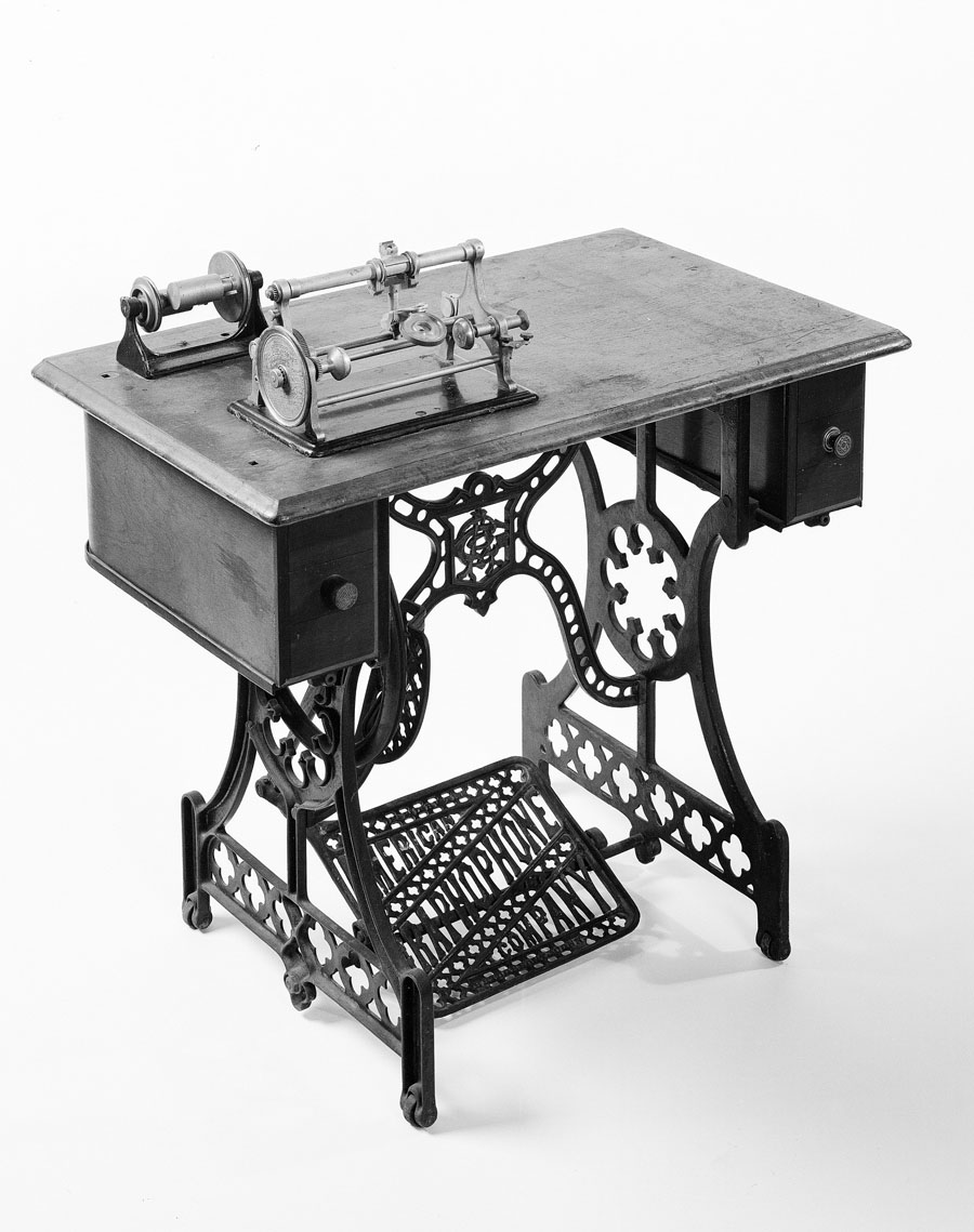 Tainter refined the design, patented several versions of it, and oversaw the manufacturing of the first six experimental graphophones at Bergmann & Co in New York in 1885. He also supervised the making of commercial models in a sewing machine factory in Bridgeport, Conn., beginning in 1887. In these early commercial machines, the dictation apparatus sits atop a sewing machine table and employs a treadle to rotate the mandrel holding the cylinder recording.