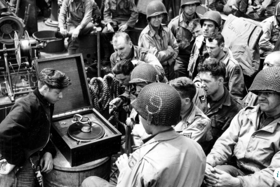 showing US Army personnel listening to a disc playing "Victrola"