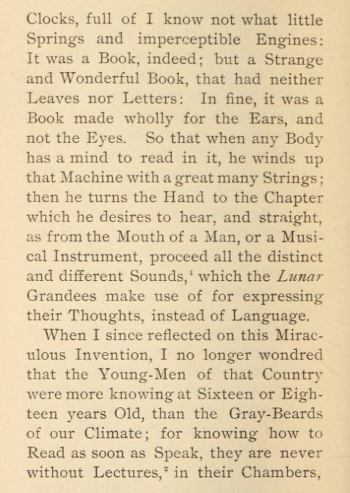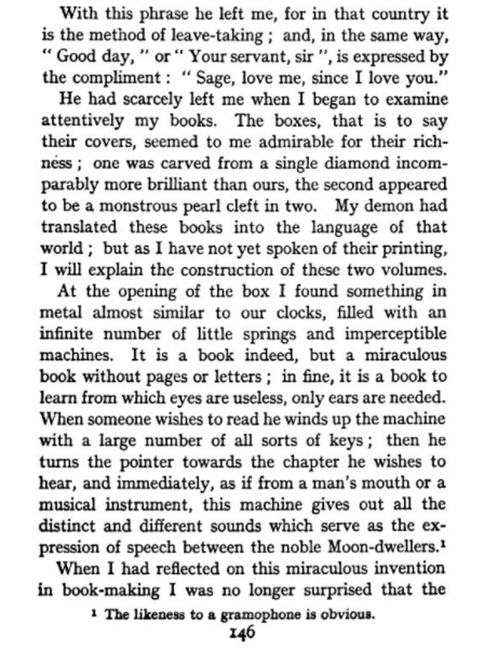 Here's how Daniel Marty summarizes Cyrano de Bergerac's literary prediction of the phonograph as invented by Moonmen and described in Bergerac's Voyage to the Moon (published posthumously in 1657). The following comes from page 10 of Daniel Marty's The Illustrated History of Phonographs. (1)
