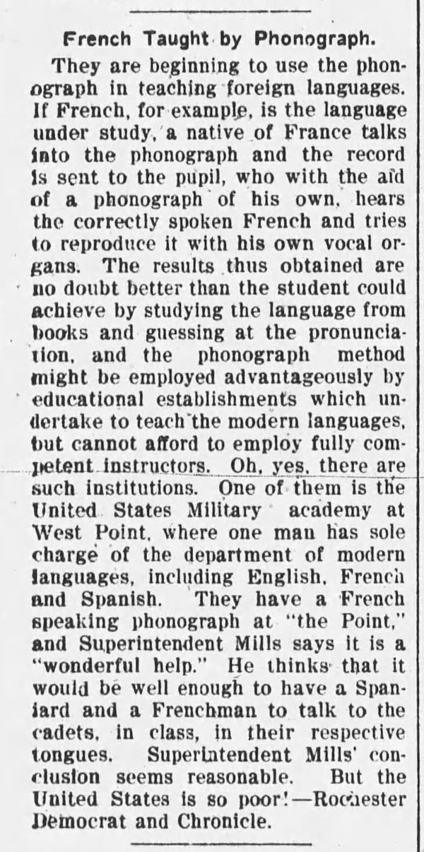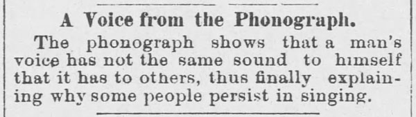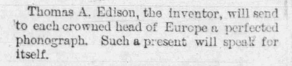 Most of the early articles appearing in local newspapers about the phonograph originated from newspapers in larger cities. In the 1880's articles often described how the phonograph was being improved and what it would soon do, often with humor. Long before many would hear a phonograph they would read about how it was being used around the USA and the world. When the phonograph became a consumer product in the 1890's the phonograph ads began appearing in newspapers and national magazines.