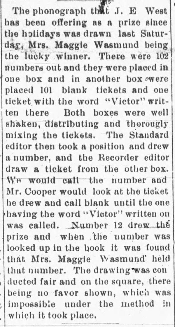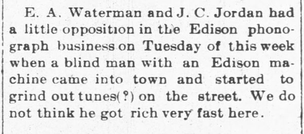 Advertisements for local businesses that were selling phonographs and records are also included along with 'notices' of recent purchases of a phonograph that would be identified in newspapers as part of its promotion.