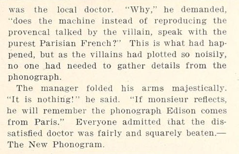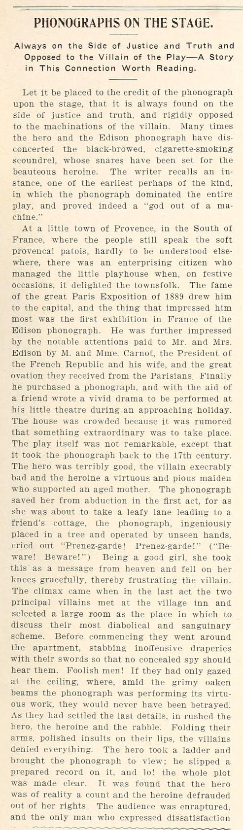 The hero was terribly good, the villain execrably bad and the heroine a virtuous and pious maiden who supported an aged mother. The phonograph saved her from abduction in the first act, for as she was about to take a leafy lane leading to a friend's cottage, the phonograph, ingeniously placed in a tree and operated by unseen hands, cried out "Prenez-garde! Prenez garde!" (Beware! Beware!) Being a good girl, she took this as a message from heaven and fell on her knees gracefully, thereby frustrating the villain. The climax came when in the last act the two principle villains met at the village inn and selected a large room as the place in which to discuss their most diabolical and sanguinary scheme. Before commencing they went around the apartment, stabbing inoffensive draperies with their swords so that no concealed spy shoud hear them. Foolish men! If they had only gazed at the ceiling, where, amid the grimy oaken beams the phonograph was performing its virtuous work, they would never have been betrayed. As they had settled the last details, in rushed the hero, the heroine and the rabble. Folding their arms, polished insults on their lips, the villains denied everything. The hero took a ladder and brought the phonograph to view; he slipped a prepared record on it, and lo! the whole plot was made clear. It was found that the hero was of reality a count and the heroine defrauded out of her rights. The audience was enraptured..."