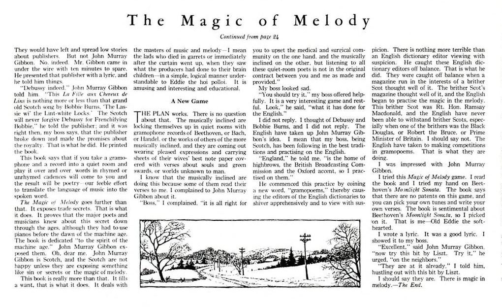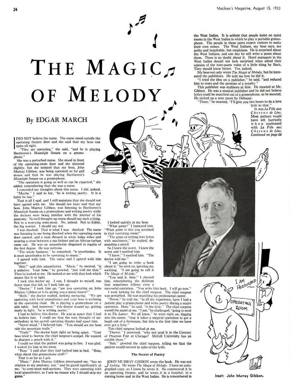 This short story appeared in Maclean's Magazine in 1933 as told by Edgar March about his boss, John Murray Gibbon, who had an operation for gall stones while listening to a gramophone and writing poetry in the operating room. Gibbon became the creator of "gramopoems," i.e., poems written while listening to the gramophone.