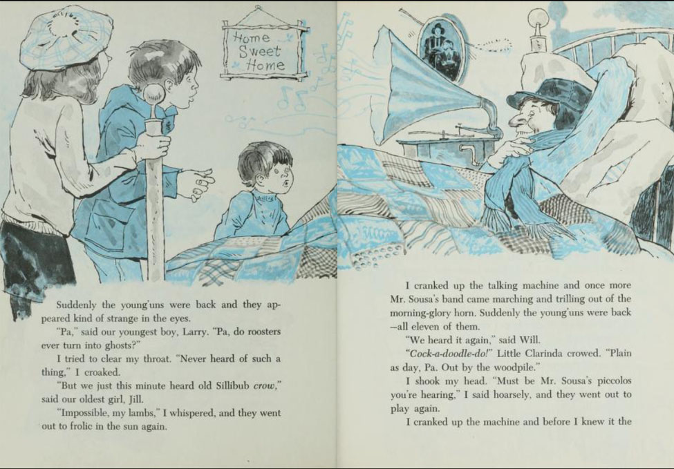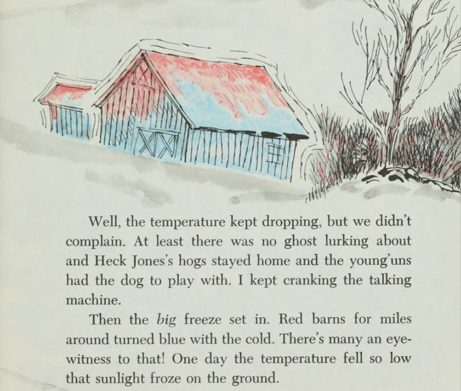The following year an even more uncommon cold winter came. It was a "dreadful cold winter" and in the Winter of the Big Freeze "some downright unusual things" happened. "Red barns for miles around turned blue with the cold." "One day the temperature fell so low that sunlight froze on the ground." Through it all the family listened to their talking machine and John Philip Sousa's band. "My, those piccolos did sound pretty!" But when the ghosts came back, to Mr. McGroom's great displeasure, they were even able to fool him into thinking he was hearing the piccolos from his talking machine. "Confound that haunt!" McGroom exploded. "Now it's imitating John Philip Sousa's entire marching band!"