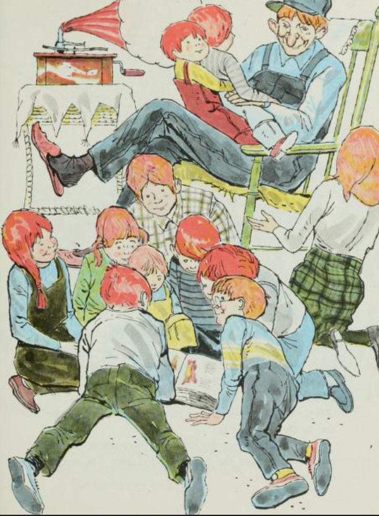 As a book on the shelf of Phonographia's PhonoLiterature this story has references to both playing records and illustrations of listening to the phonograph.